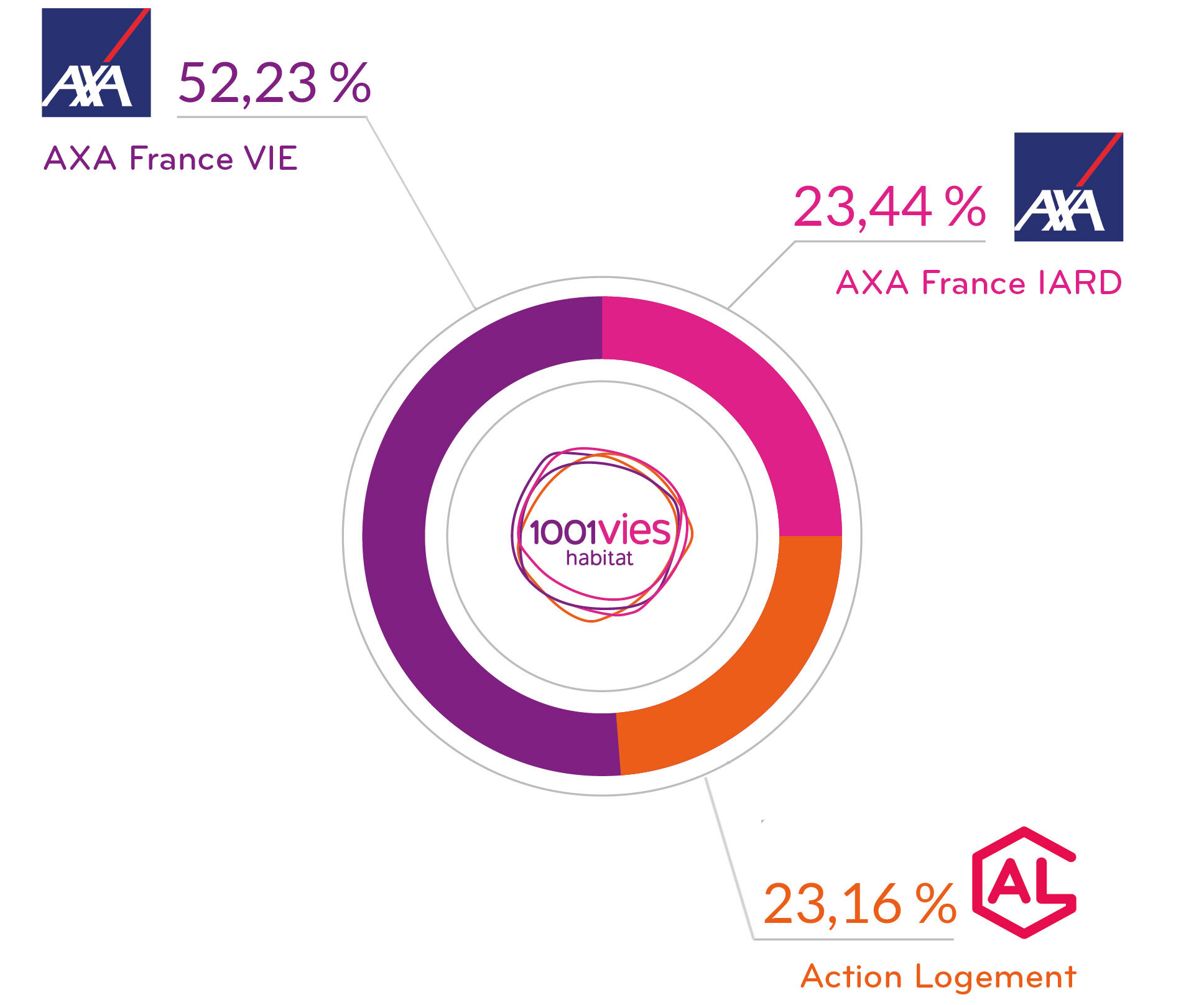 AXA France VIE est le principal actionnaire de 1001 Vies Habitat (52,5%), avec AXA France IARD (23,44%) et Action Logement (23,16%).
