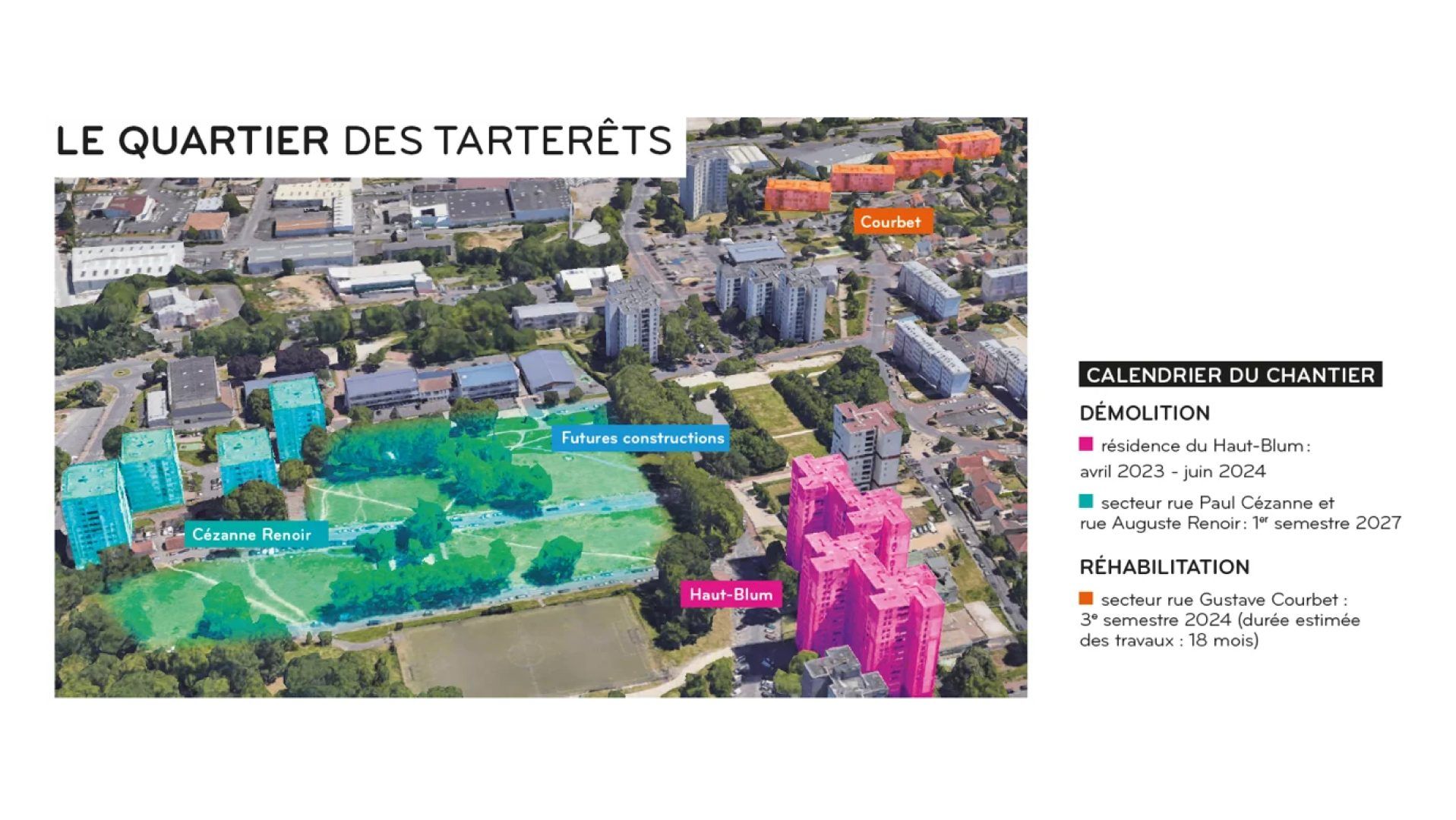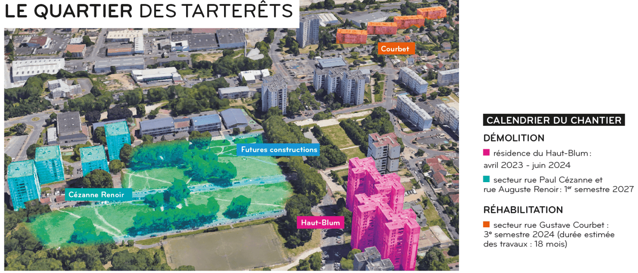 Ce deuxième chantier s’inscrit dans le cadre Nouveau Programme de Renouvellement Urbain (NPRU), dont la convention a été signée en mai 2022.  Au programme pour 1001 Vies Habitat :  la démolition de 485 logements sur les secteurs Haut-Blum et Cézanne-Renoir, ainsi que la réhabilitation de 176 logements sur le secteur Courbet.